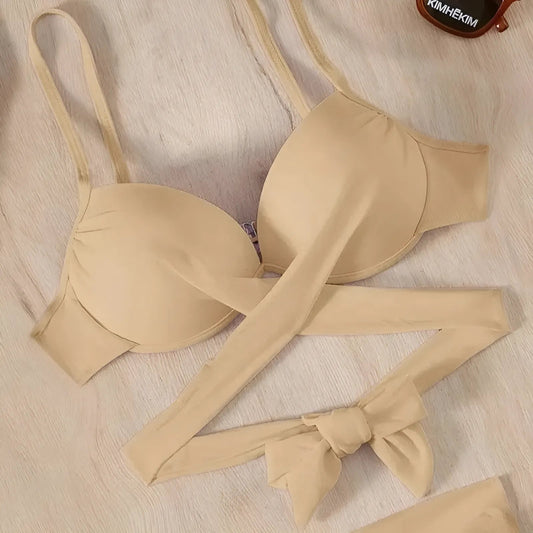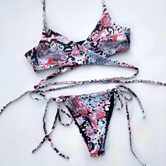 Maillot de bain bikini deux pièces avec liens et fleur décorative