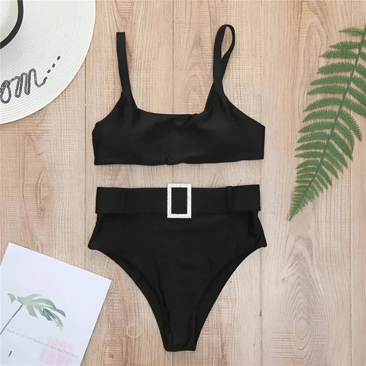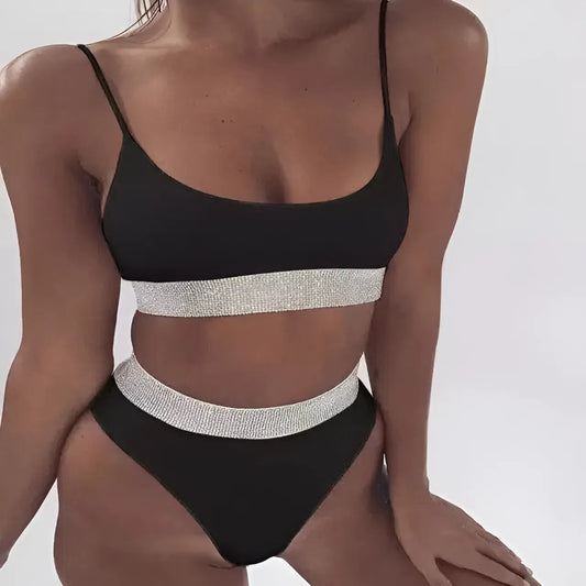 Maillot de bain deux pièces avec fermeture décorative sur le bas.