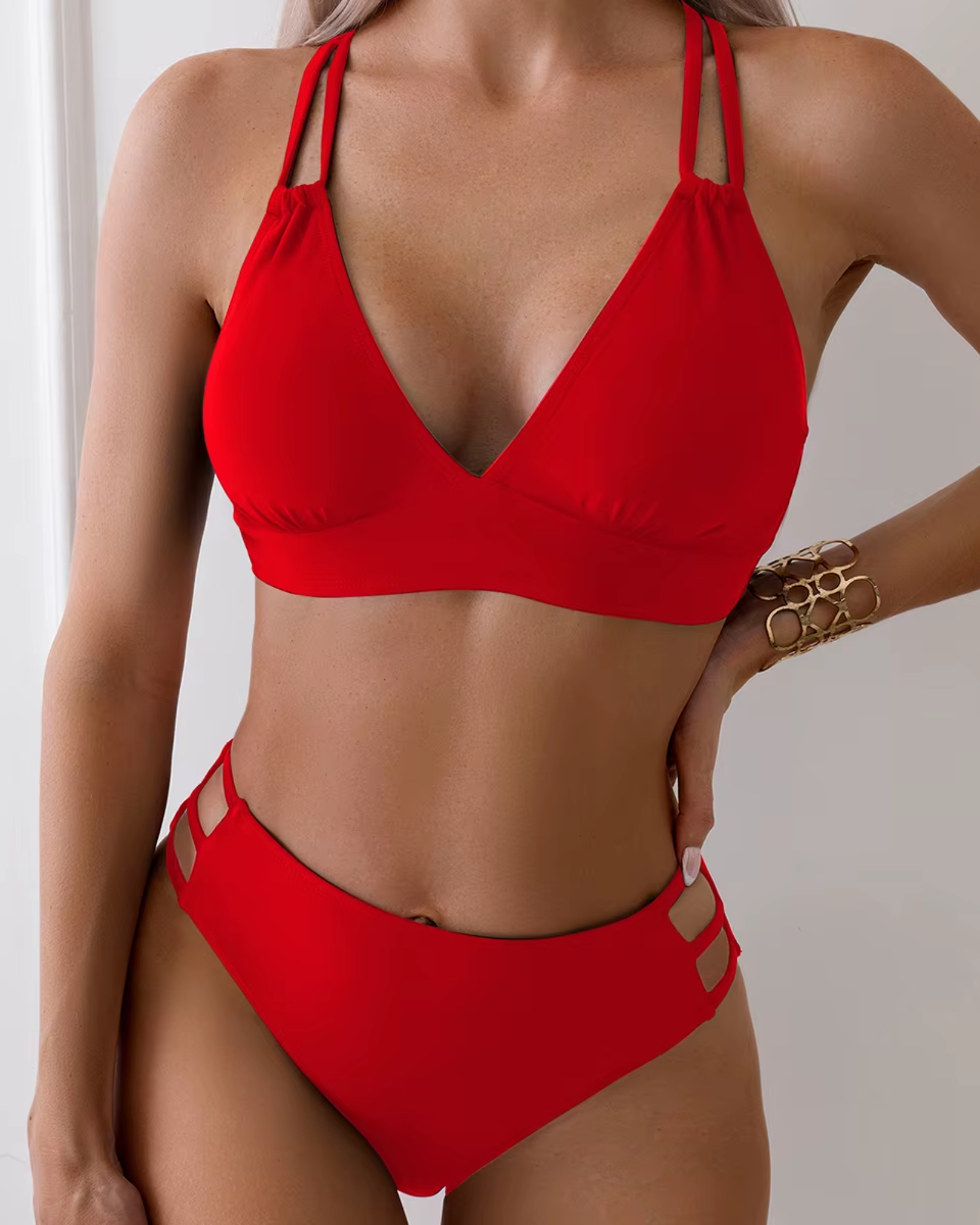 Ce maillot de bain est l'essence du style et du confort, conçu pour les femmes qui souhaitent se sentir confiantes et sensuelles. Les bretelles croisées dans le dos lui ajoutent une touche d'originalité, tandis que le lien réglable garantit un ajustement parfait à chaque silhouette. La taille haute des culottes met magnifiquement en valeur la taille, donnant à la silhouette un aspect élancé, et le décolleté audacieux attire les regards.